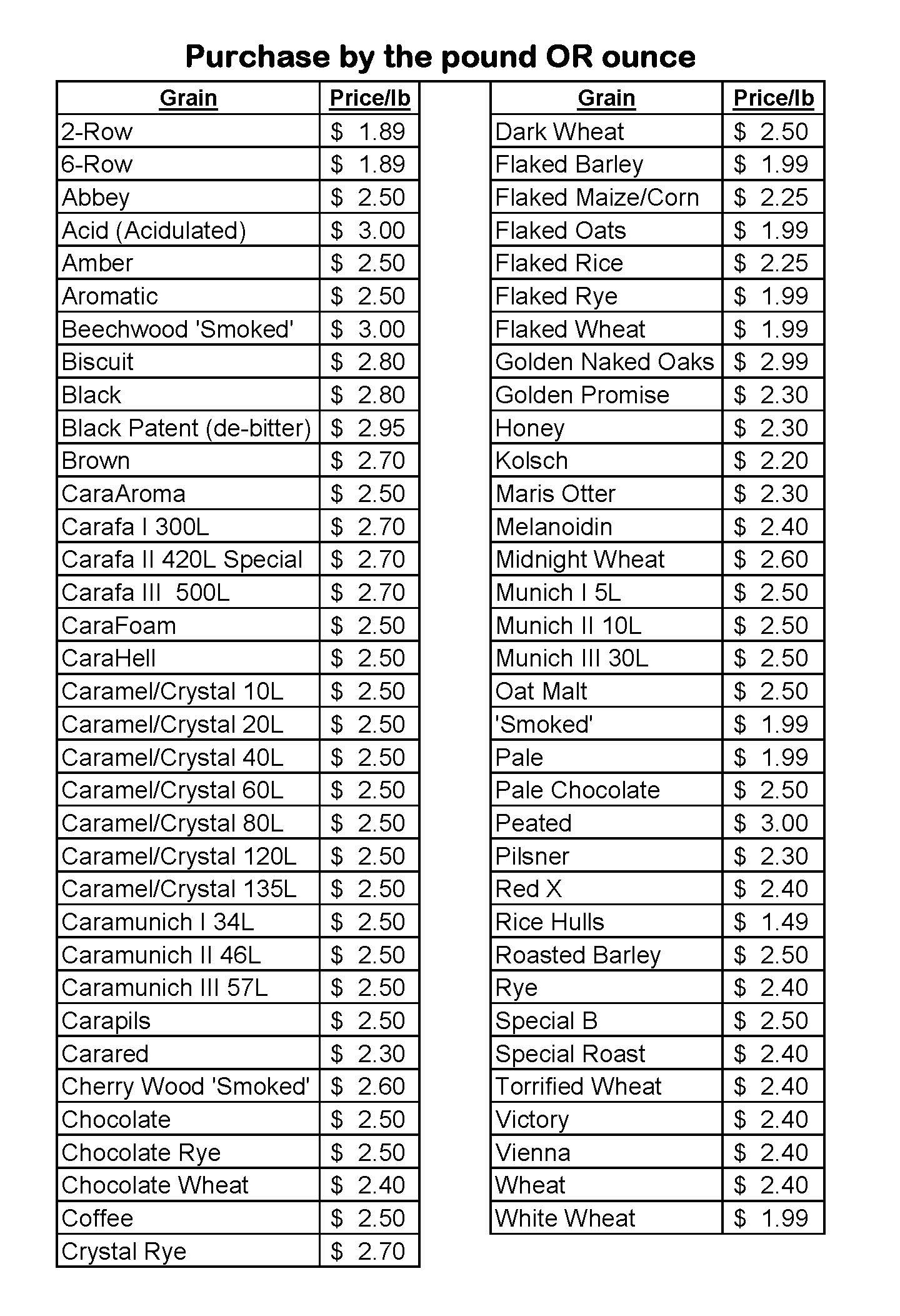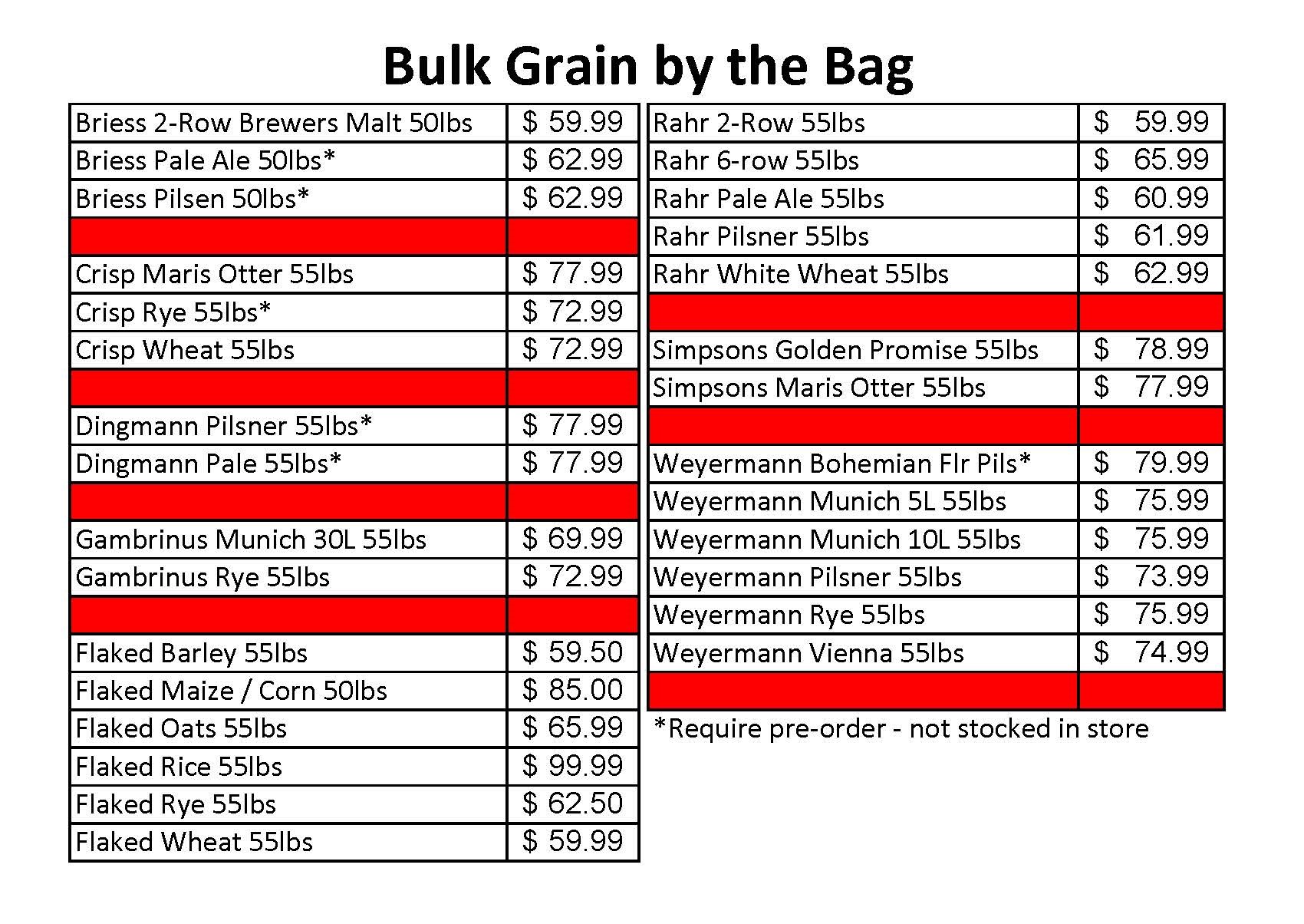 Grain We sell grain by the ounce, pound and bag. Please call Patriot to confirm what grain by the bag is available at the time of need. If we do not have it we can order it.